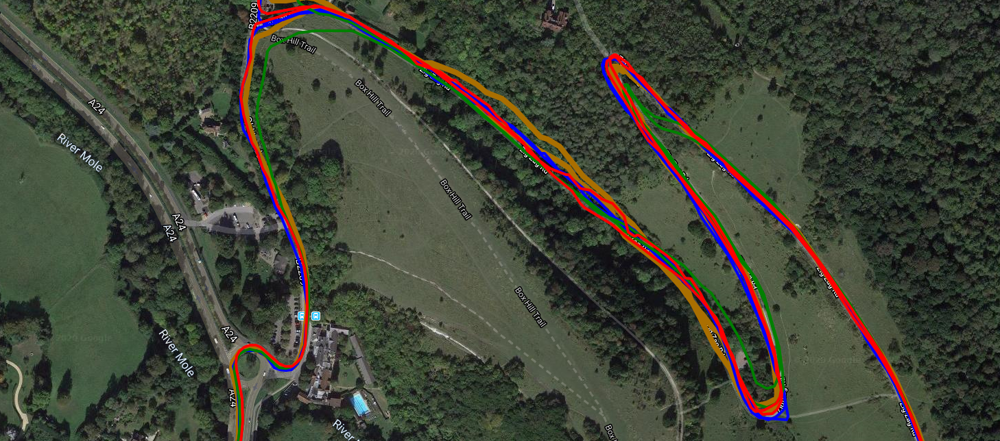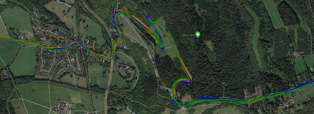 Here’s a more recent ride with the Dash in yellow going up Box Hill twice. It’s not a particularly hard hill, it has the only smooth roads in SE England (because of the 2012 Olympics) and that’s why everyone goes there. Each devices’ track look good when zoomed out so the subsequent image zooms in a bit