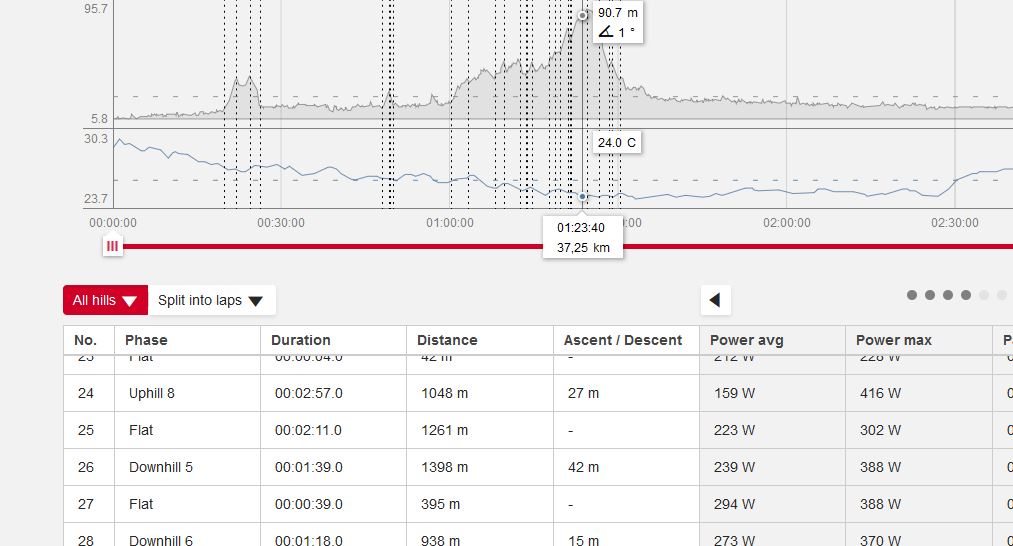 - Hill splitter seems to work on most (all?) run and bike profiles. Whilst it DOES seem to nicely recognise uphill and downhill slopes correctly it doesn’t recognise non-continuous hills ie where a 1000m total climb is made up of multiple up/down sections…or a 100m one 😉 like this