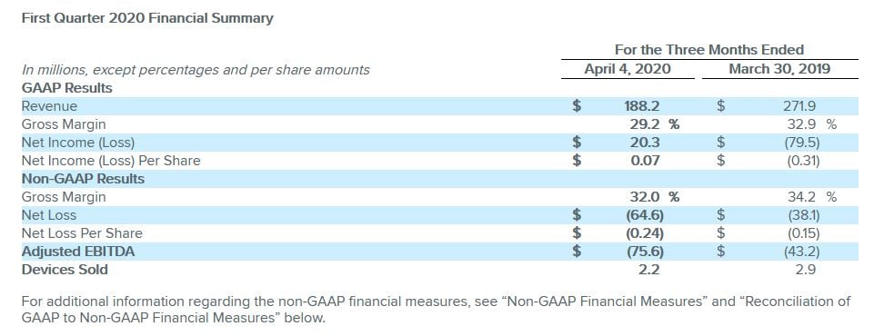 - “Smartwatch devices sold grew to 54% of revenue, up from 42% in the first quarter of 2019. Trackers devices sold declined to 42% of revenue, down from 57% in the first quarter of 2019.”