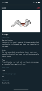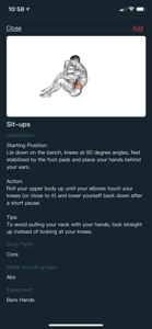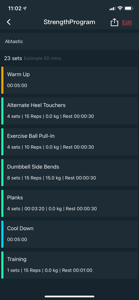 The app has a very impressive list of 200 individual exercises in the exercise catalogue and it’s great how they are organised alphabetically (no big deal) and then by body part. So in the images above, I created a hilariously named workout ‘abtastic’ but it was simple to choose the right series of appropriate core exercises. And if I was unclear on what any of them involved there were good descriptions aided by an animated graphic. Whilst many exercises suggested a WEIGHT, other exercises like PLANKs were able to be defined on a time basis. As it should be.