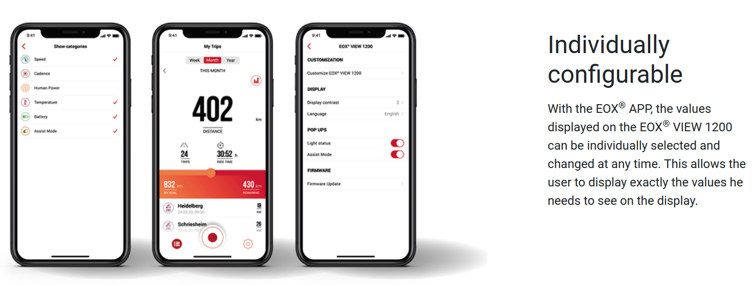 The EOX 1200 is super-slimline – it doesn’t need an inbuilt battery – and the display looks super-clear but somewhat limited in the rider info it can display.