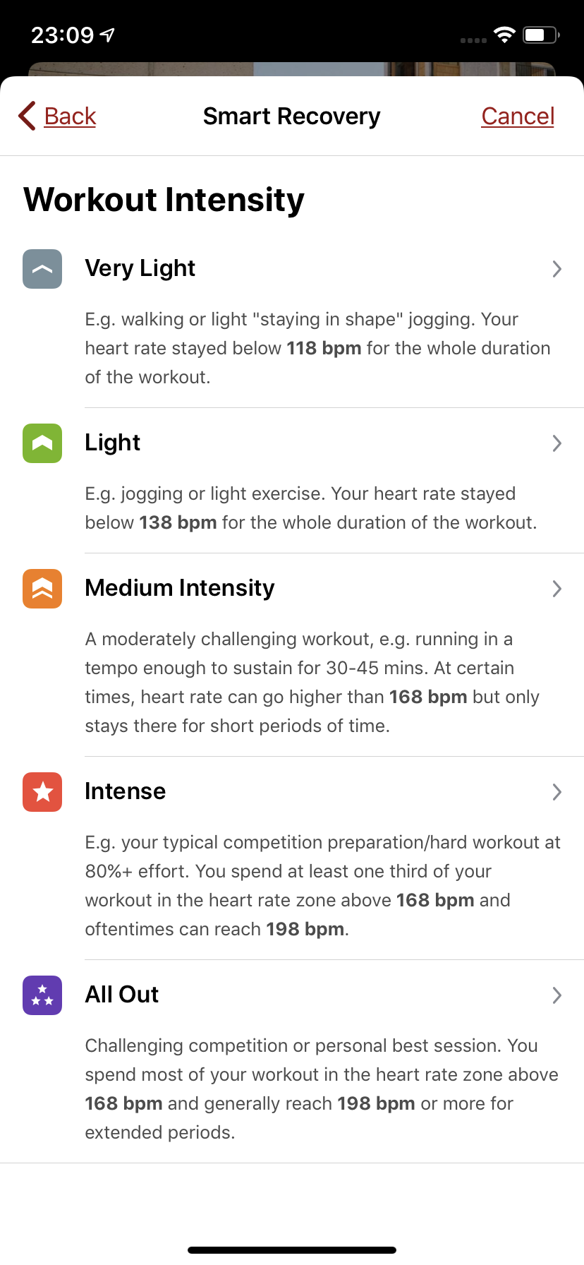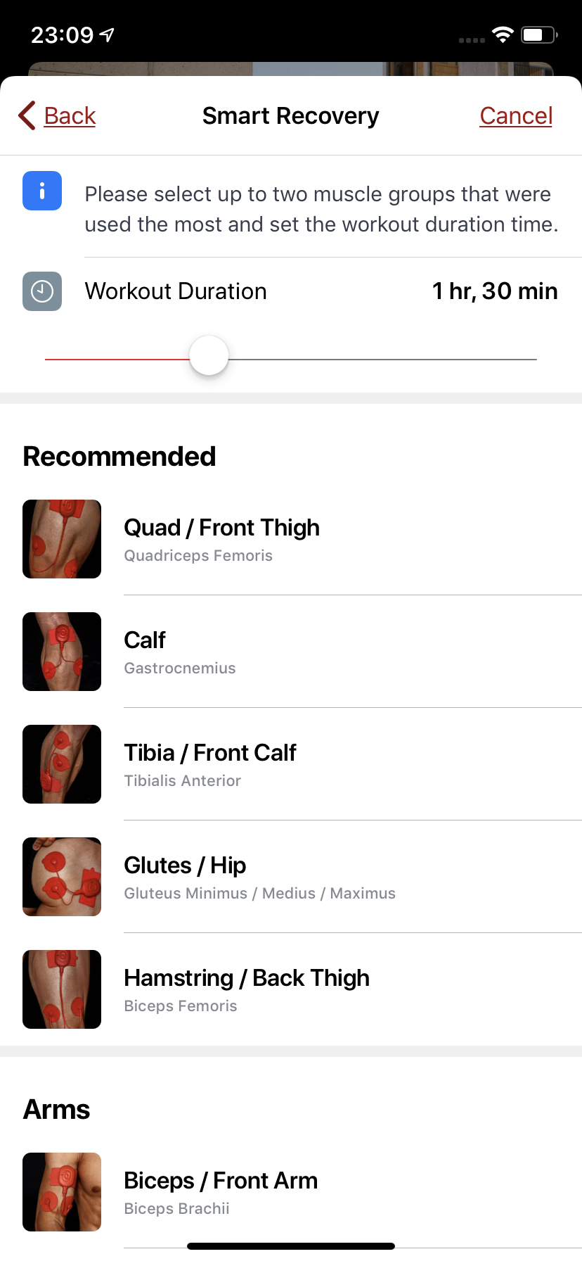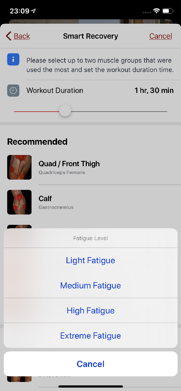 Smart Recovery was also great for the wannabe athlete in me, again this targets specific muscles groups that are selected from those used in your last exercise eg running muscle groups. you then say what level of intensity of running (eg) workout you’ve just completed, choose the duration of the PowerDot workout and off you go.