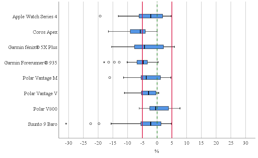 The study by Drs Gilgen-Ammann, Schweizer and Wyss can be found here and was peer-reviewed by Pobiruchin & Wiesner in early 2020. Interestingly the authors also have another study solely on the Polar Vantage here. Nevertheless, the study looks at 3 Polar devices, 2 oldish Garmin Fenix 5 based watches, the top-end Suunto, a Coros and an Apple Watch 4. That’s a reasonable selection, albeit biased towards Polar and I will also say that reasonable firmware versions were used but that a fairer reflection of Garmin might have used more recent devices.