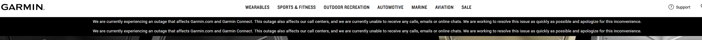 “We are currently experiencing an outage that affects Garmin.com and Garmin Connect. This outage also affects our call centers, and we are currently unable to receive any calls, emails or online chats. We are working to resolve this issue as quickly as possible and apologize for this inconvenience.”