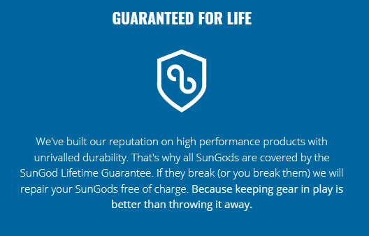 There is a “lifetime guarantee against breakage” – I’d check the small print on their site when you buy but it looks like it genuinely covers the frames but would not, for example, cover a scratched lens.- Capsule cases and spare lens kits are available for an additional cost and in this SunGod Vulcans Review, we would recommend getting those extras when you buy the sunglasses to reduce the effect of postage costs.