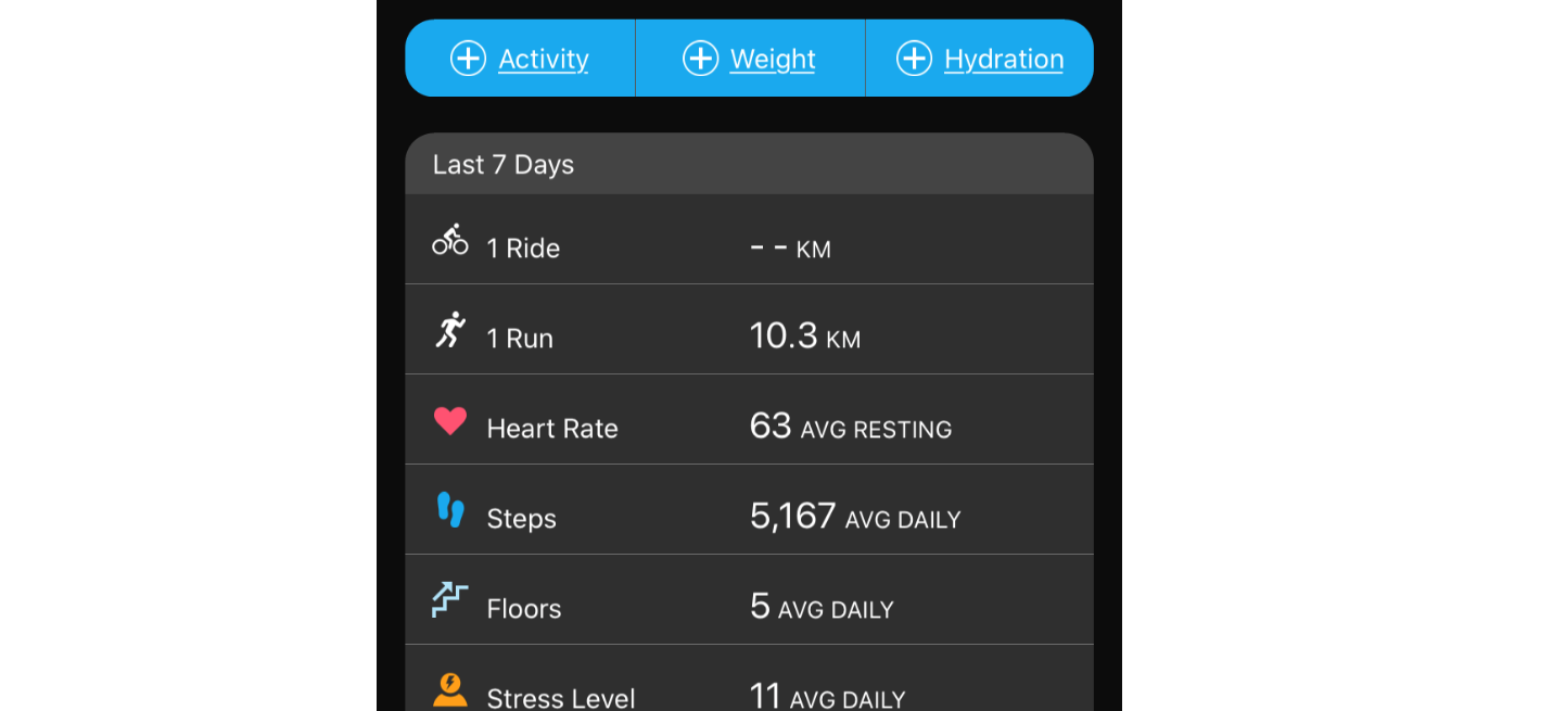 RHR shows (incorrectly I might add, but it’s there) High for the day does not. Sleep metrics show up detailed in the watch, not in GCM. Body Battery and Respiration show up, but no metrics but a static number. Stress has disappeared from GCM altogether and I don’t know why.