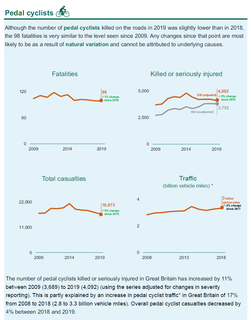 The figures show that, whilst deaths have risen over the last decade, some of the increase can be explained by increased cycling usage. Perhaps a more detailed analysis would break out the at-risk groups – cyclists of a certain type or cyclists riding in more dangerous situations, like cities.