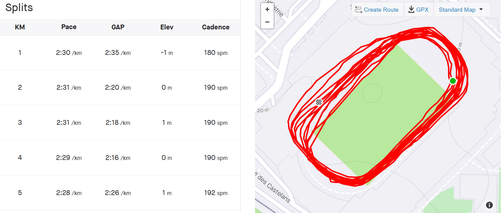 I was hoping to get detailed STRAVA stats. A little known trick is that you can add /export_gpx or export_tcx to the end of any STRAVA activity like this https://www.strava.com/activities/3962494314/export_gpx and you can then download all the file’s details. However, the TCX file seems to be protected in this instance, yet you can download the GPX file but it has been stripped of all meaningful data, even laps. Which is a shame because the STRAVA post, above, has Joshua’s cadence down as 180 for the first lap but 190/192 for the remaining laps. Which I thought was great and would be interesting to delve further info.