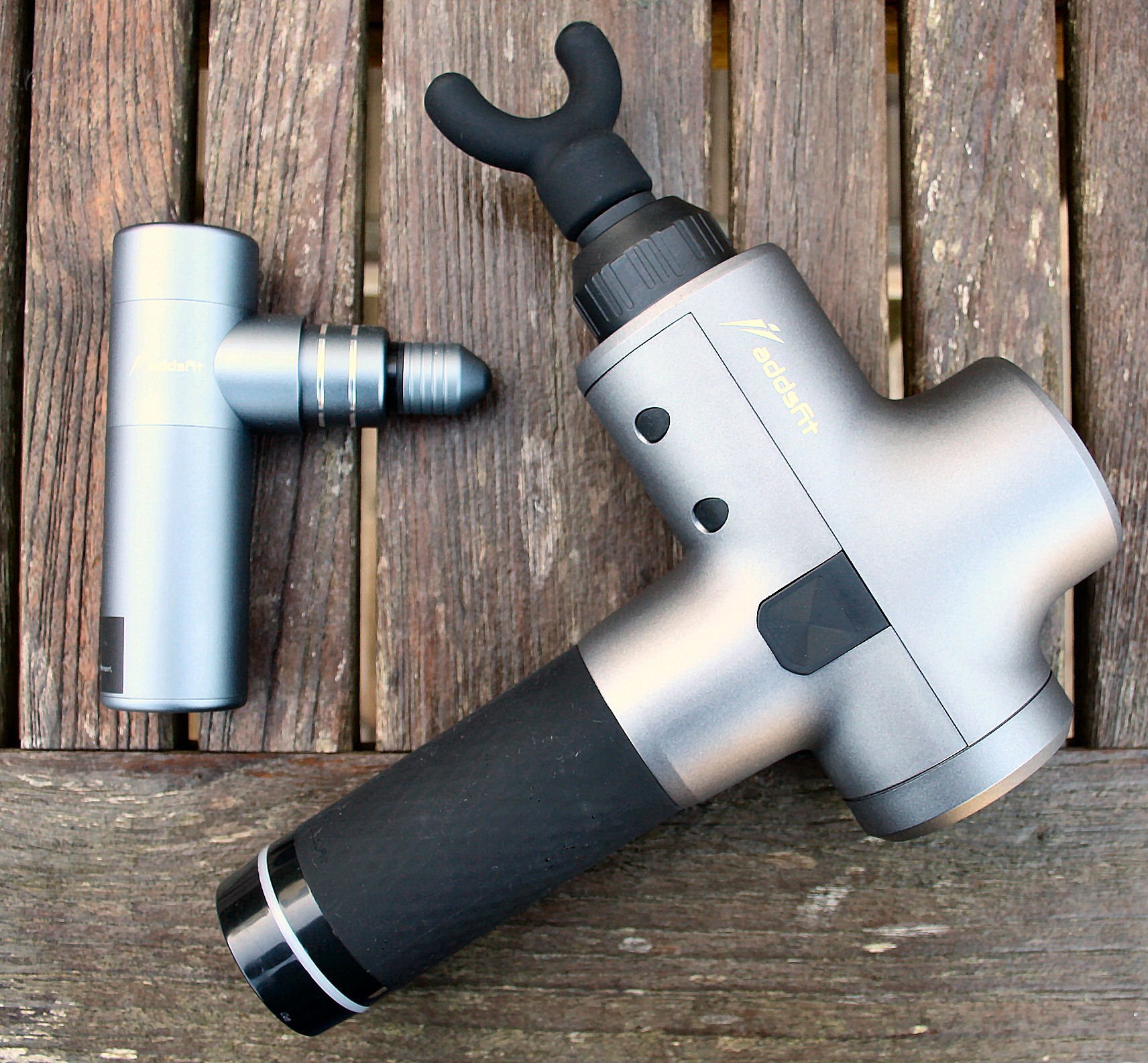 I love my Thumper Mini Pro and use it a lot. However, it’s a bit heavy for frequent, prolonged usage and doesn’t always massage deeply enough. Also, it’s quite long and that means that the weight at the end of the Thumper feels heavier than it should. So I went in search of ‘something else’ and the addsfit mini seems a good value percussive massager that fills the gaps where my Thumper sometimes struggles. As the following image shows, they are completely different beasts of a totally different scale.