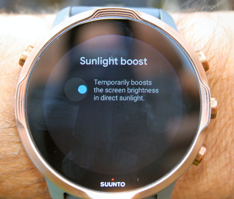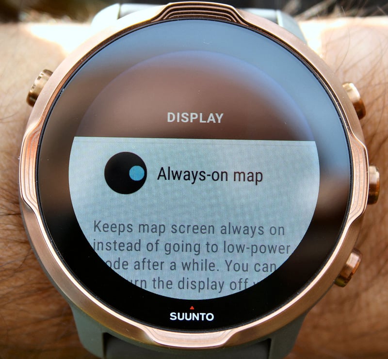 - | Always-on display | Always-on Maps | Set brightness to 11 | – Beautiful displays eat battery for breakfast, lunch and dinner. But sometimes we just want the screen always-on and to hell with the consequences. Suunto has leveraged a lower power processor in the underlying chipset to make ‘always-on’ much friendlier even during workouts. Sure, a bit more power is used compared to the blank screen of old but the savings compared to a normal ‘always-on-sport’ screen seems very good. However, what Suunto giveth with one hand, they taketh away with the other, in this case, the ‘other’ is an always-on map screen option. My understanding is that this uses the regular higher-consuming battery mode. Do you still have some of that battery left? Not to worry there’s also a ‘Sunlight Boosting Mode‘ which will use up even more juice as you crank the volume knob up to 11/10 (yes brightness really does go that high), at least this will permanently put to bed any complaints of poor readability in bright sunlight 😉