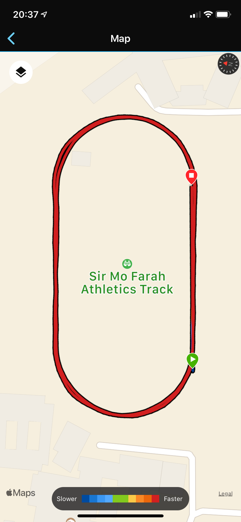 A: Many of us run track at some point and are happy with pacing to stopwatch-lap times but when you want to look at your post-race stats its nice to have a decent representation of where you’ve been running rather than a messy scrawl. As well as that a decent log of the actual distance you’ve run would be great. Normally your watch will record something like this, albeit not as fast.