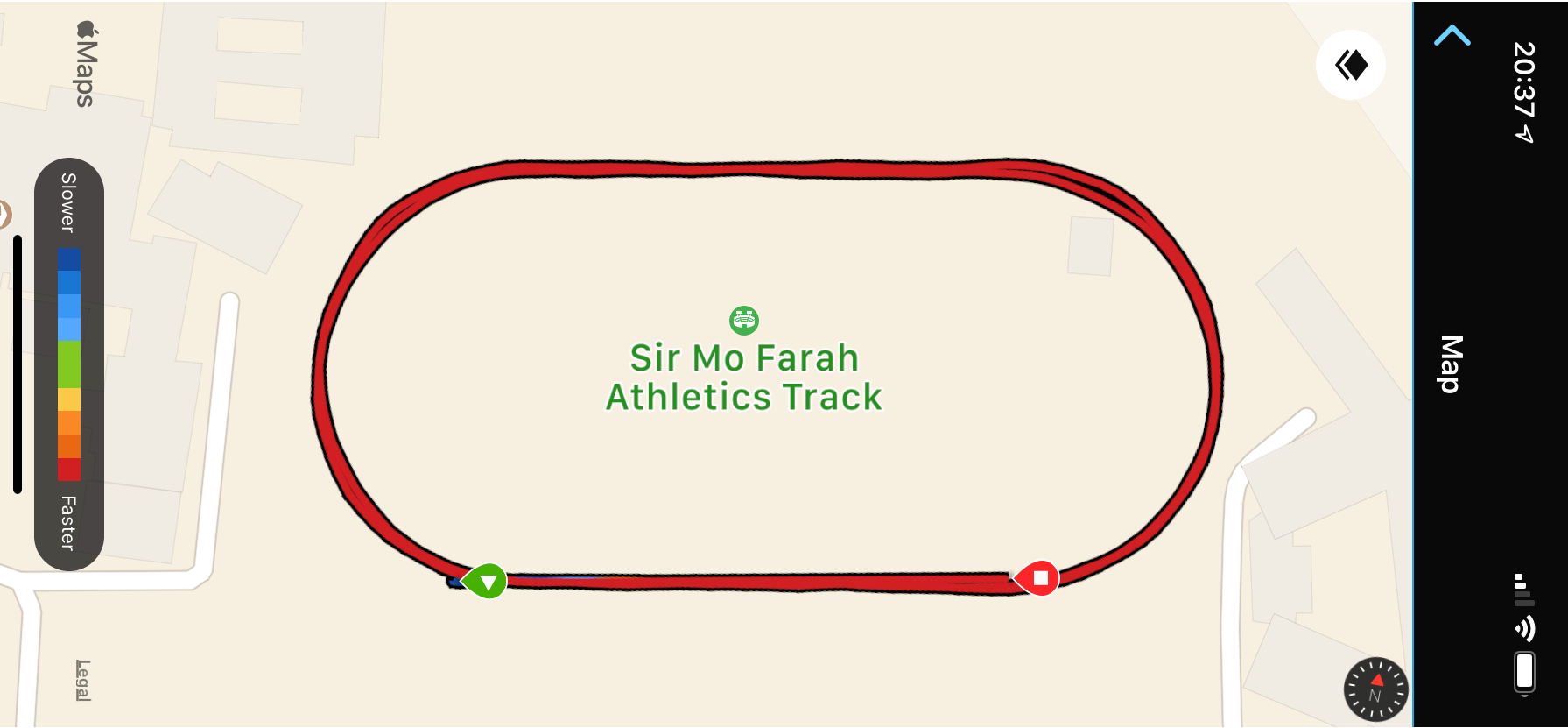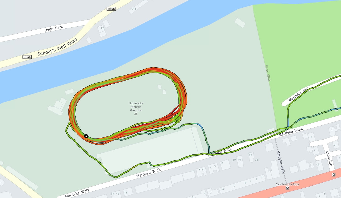 This then brought me back full circle to something that @JohnK alerted me to, which neither of us had seen until recently. Garmin Connect (mobile) now colours your running track based on pace, heart rate or elevation. This just seemed to tell me that I did 2 fast (red) laps…but they weren’t fast, although they were consistent and that’s maybe why Garmin shades them like this in this particular instance, John’s image shows up the colours a bit more nicely.