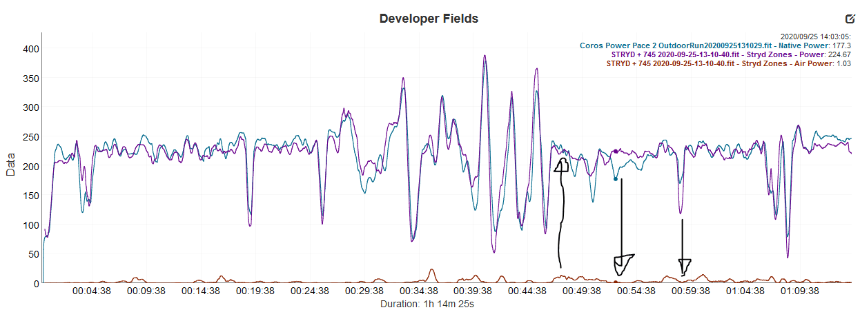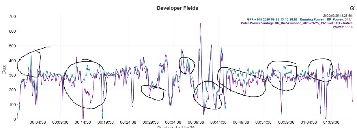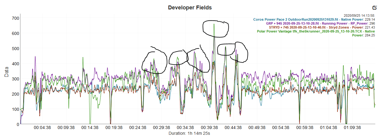 I used dcrainmaker’s dcranalyzer tool with smoothing initially set to 20 seconds and I’ve circled the ‘hills’. from a technical perspective, the Analyzer tool is the easiest way to compare developer fields. There are other ways but they are a PITA.