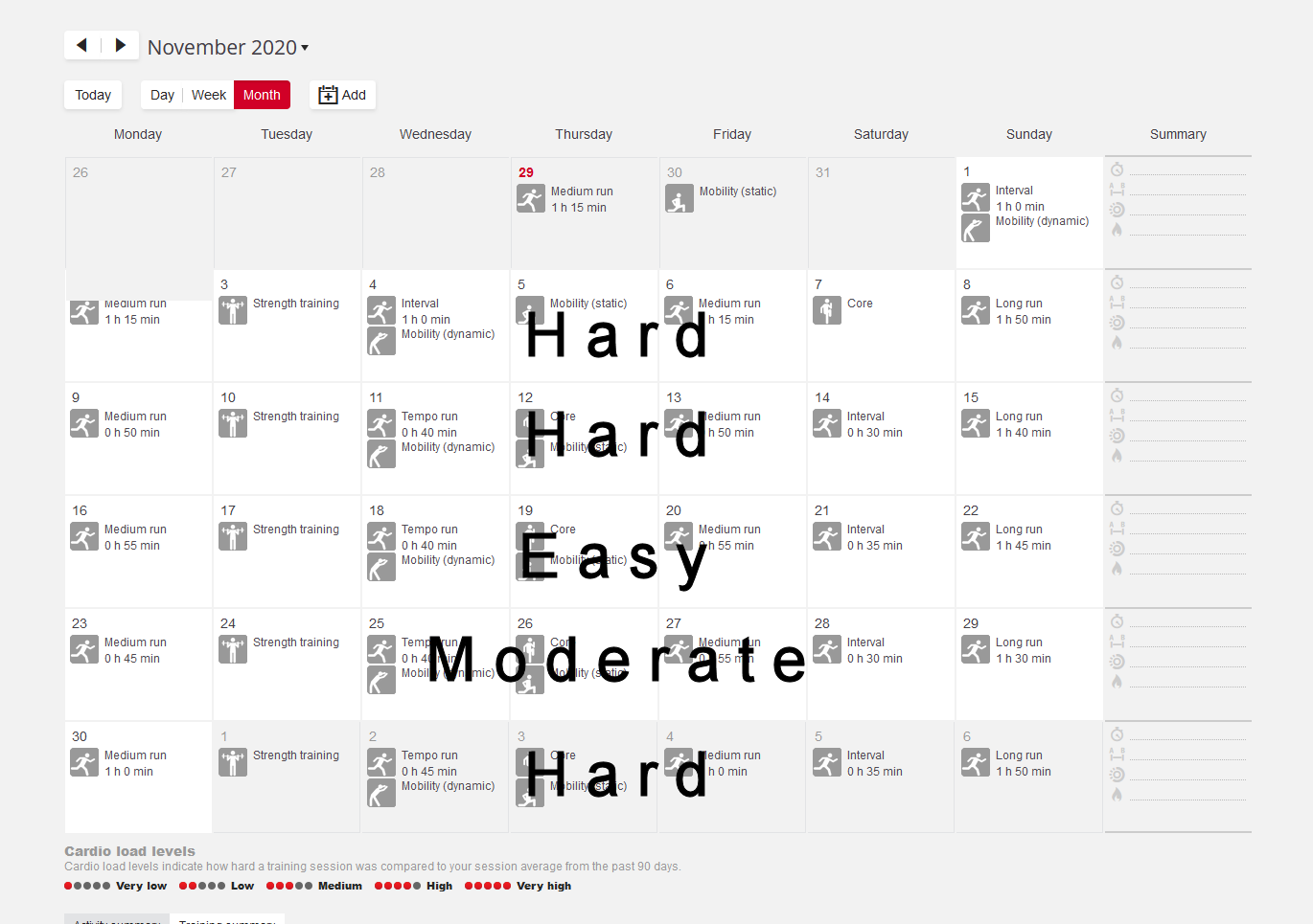 Easy means 2/3rd or even half the volume of other weeks and Hard means that 5k pace or Tempo pace work is included at least once. And remember this is for MARATHON training. So this broad approach seemed better than progressively and slavishly aiming to raise your weekly mileage and intensity.