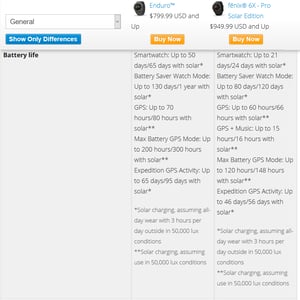 - New, better like-for-like battery life than anything that has come before from any manufacturer, ever. 70 hours with GPS, 80 hours with solar+GPS. #Impressive