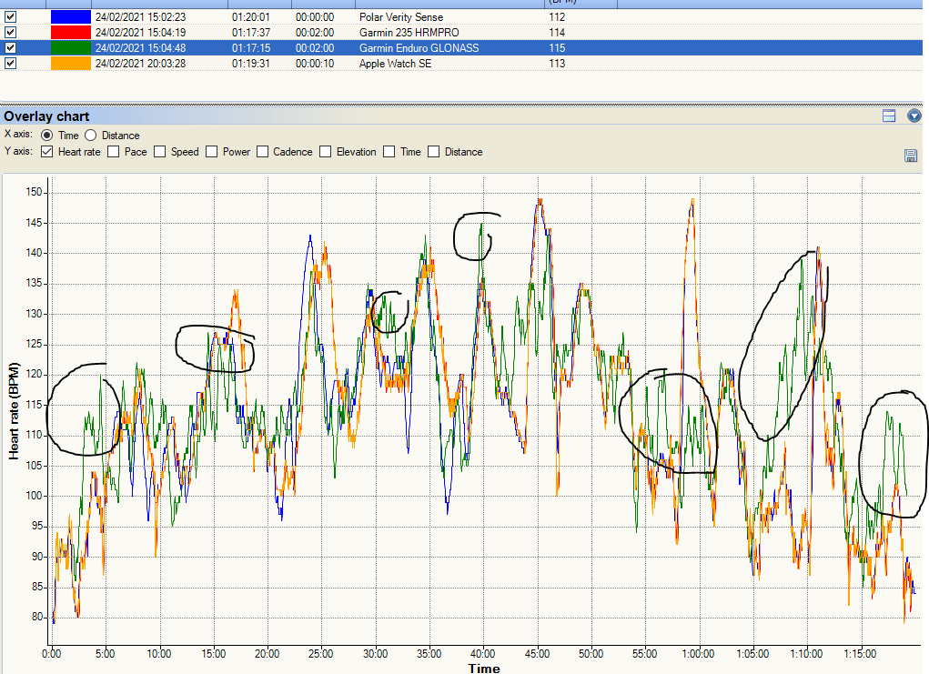 - Did I mention the heart rate? Here I’m on my Vasa swim trainer and the Enduro is rubbish. Perhaps actually swimming in real water would have improved it…errrr. No. I don’t even know how to set the offsets properly to line the Enduro’s HR peaks with the others, it’s that bad.