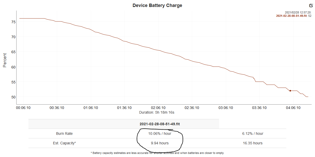 - Here is a file from a 4.5-hour road bike ride. I had the Enduro underneath an arm warmer sleeve hence there is zero solar gain even though it was fairly sunny. I had a super-simple setup using oHR and GLONASS, a R9100P Dura-Ace powermeter but the backlight was on. Using the dcrainmaker analyzer tool to check the battery you can see that it’s burning through the juice very quickly although GLONASS will also add to the drain more battery than GPS-only.