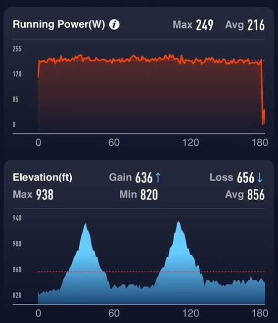 I’m guessing she used the onboard running pace rather than Stryd and the stats for that show a very even effort with a very slight uptick on the hills, and the cadence is also impressively flat at 194. Stride length does show some shortening towards the end but, hey, none of us could have done better!