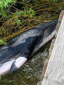 This Minke Whale is just over 3m long and probably weighs about a tonne. It is almost certainly a juvenile from last year and separated from its mother. Typically common minke whales are 2.4 to 2.8m long at birth and this one’s current length indicates it may have been one of the later ones to have been born in the 2020 North Atlantic breeding season which starts in early spring and peaks in the summer. These newborns nurse for at least 5 months, and whilst this one is likely to be weaned from mile, it’s sadly impossible for it to survive without adult protection.