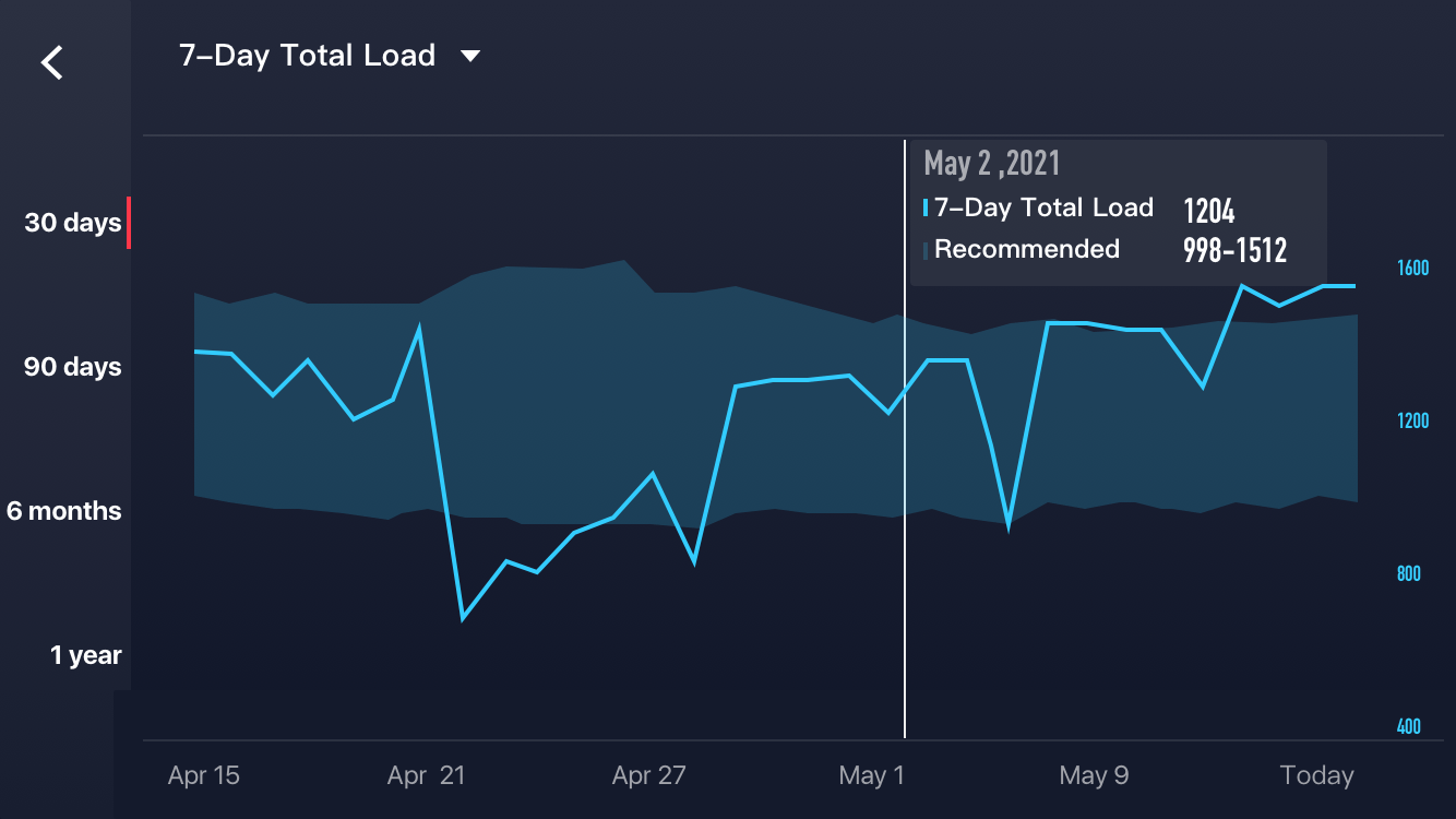 All types of workouts are scored based on the amount of time you spend in each heart rate zone. If you spend more time in a higher heart rate zone, then you earn proportionately more training load points. Generally, your load wants to PROGRESSIVELY increase, and COROS handles the progression nicely by giving you a range within which to keep your training load. In this chart, the runner might consider easing off for a couple of days as they have broken out of the recommended range.