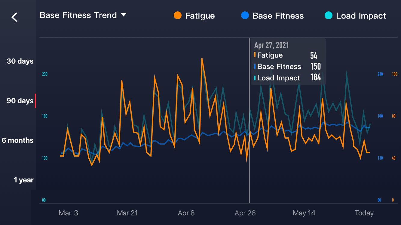 Your recent training scores over the last week will reflect your short-term tiredness. This limits your body’s ability to hit the performance levels theoretically possible based on your base fitness. You have probably already felt tired one or two days after a hard workout but there are a few obvious effects that last for longer and which will be accounted for in COROS’s Load Impact calculations.