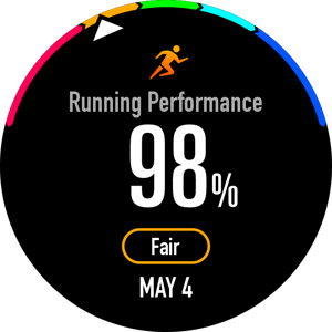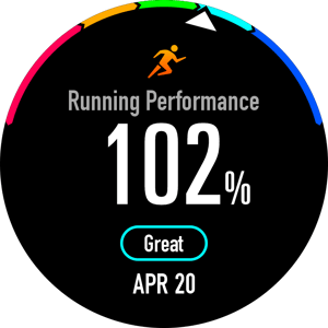 This scores your last workout against your Marathon Level. Approximately 100% is expected, and scoring over 105% indicates good performance.
