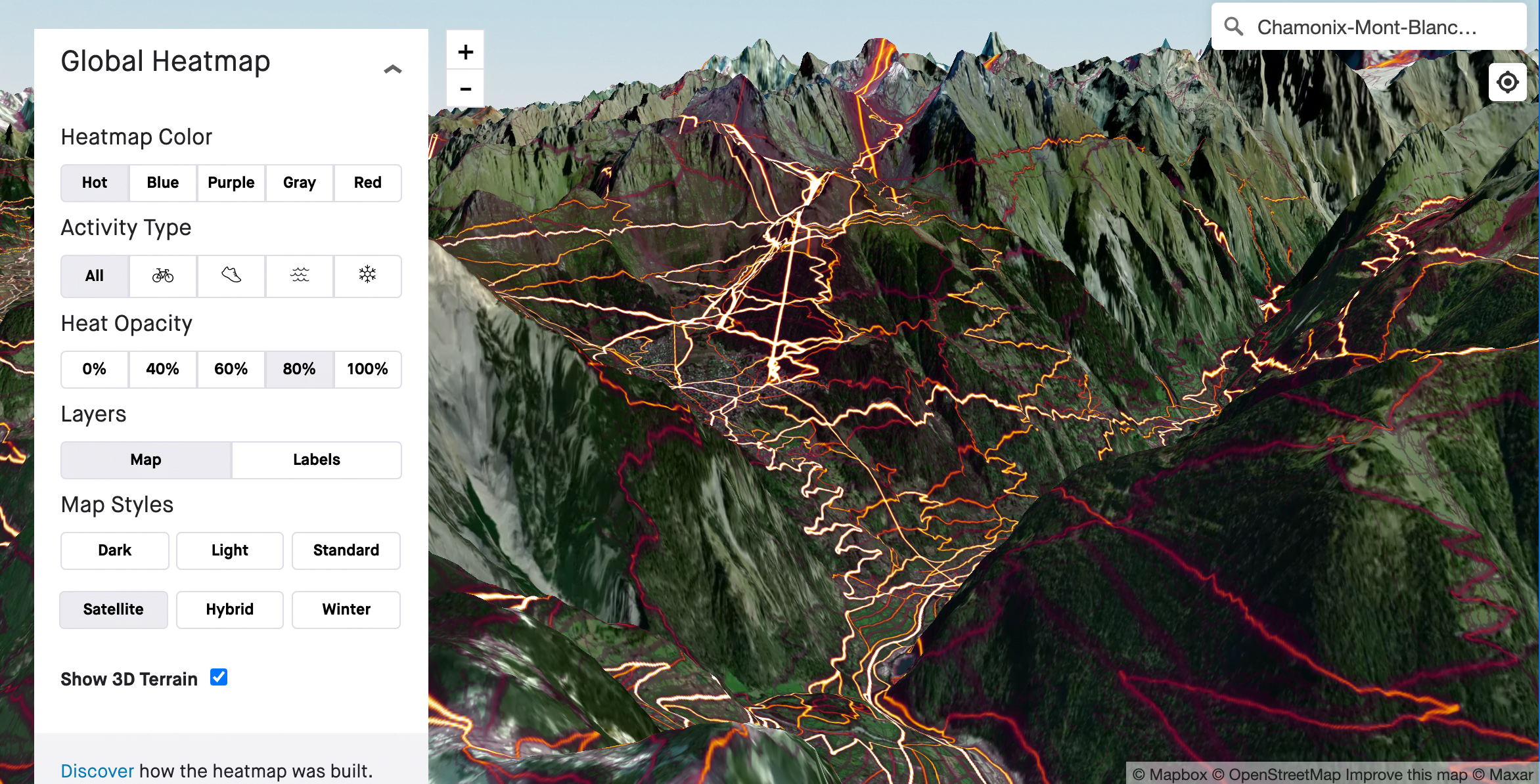 Earlier this year, Strava launched a 3D terrain view, with your personal heatmap superimposed. Today sees the addition of the global heatmap to the 3D terrain view ie you can see a consolidation of everyone’s routes in 3D and you can toggle between the global heatmap view and your personal heatmap in high definition.
