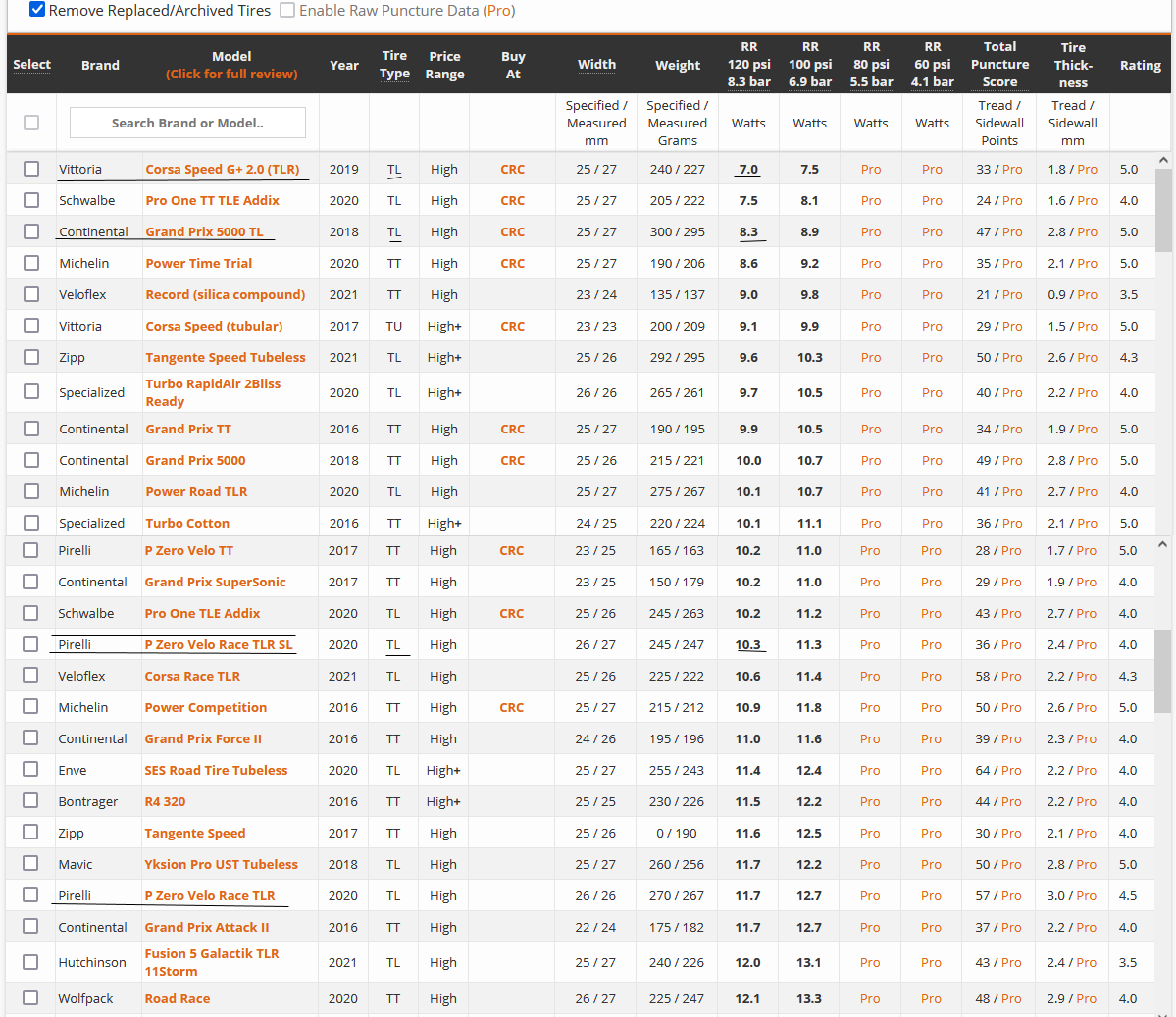 Bicyclerollingresistance shows that the watts lost from the P Zero Race SLR TLR are low, coming in at a highly creditable 11.3w @100psi. That’s not as good as the Continental GP5000 TL though which is 8.9w @100psi – almost a 5w difference over two tyres.