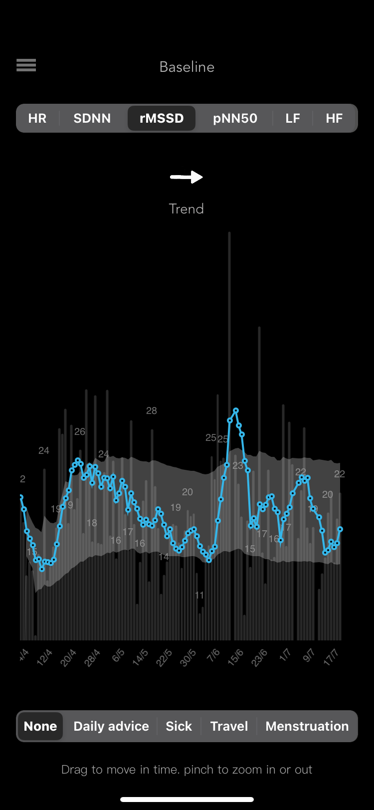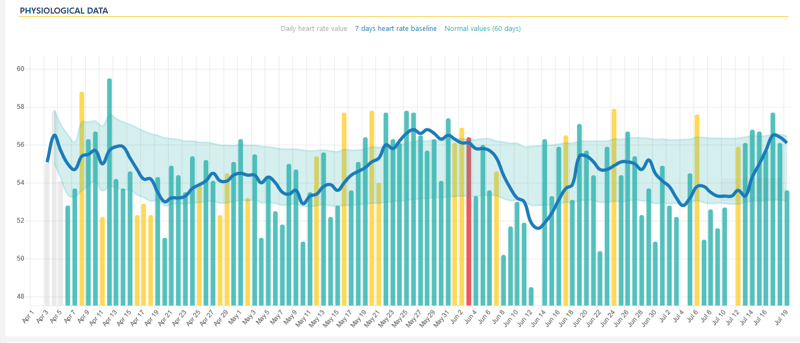 To illustrate the variability of my physiological state in the same period, here we have my rMSSD/HRV and HR/Waking HRrest data for several months and you can see that the last few weeks of each chart’s data vary quite considerably from the upper to lower end of my acceptable range (Software: HRV4Training….use it, it’s good). However, my respiration rate over the same period as stated by Apple is ‘Consistent‘. I would have expected more variation.