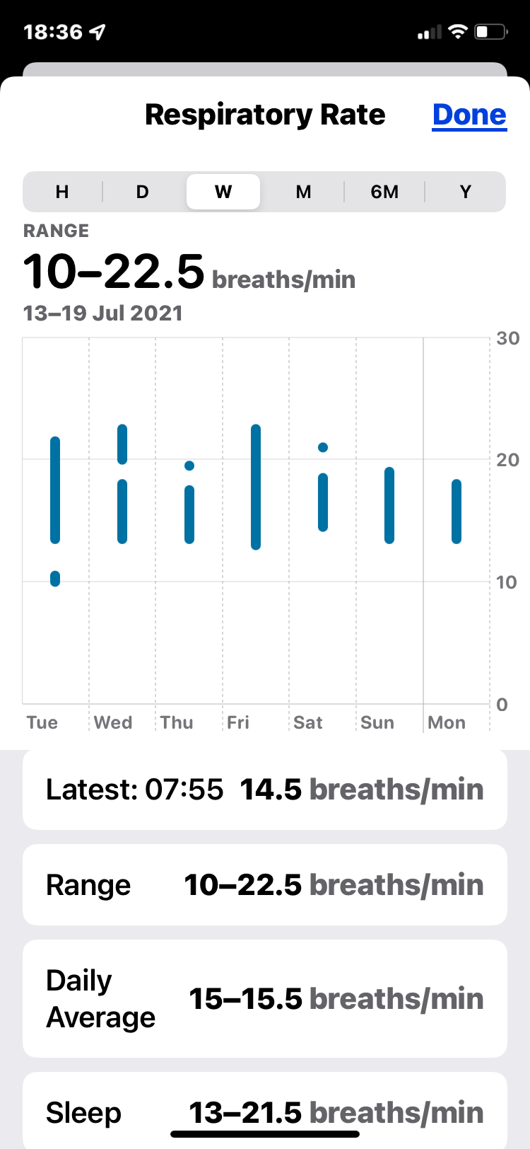 There will be little to see here for several days. Sure you might see hourly changes to your respiration rate but that probably won’t give you any insights. Expect there also to be a few gaps in the data when the watch can’t quite get the accuracy it likes but you should expect it to make a good effort at your nightly respiration data when you are moving less. Interestingly the Apple Watch senses your breaths by movements of its accelerometer rather than changes to HRV… that might sound inaccurate but it’s not!