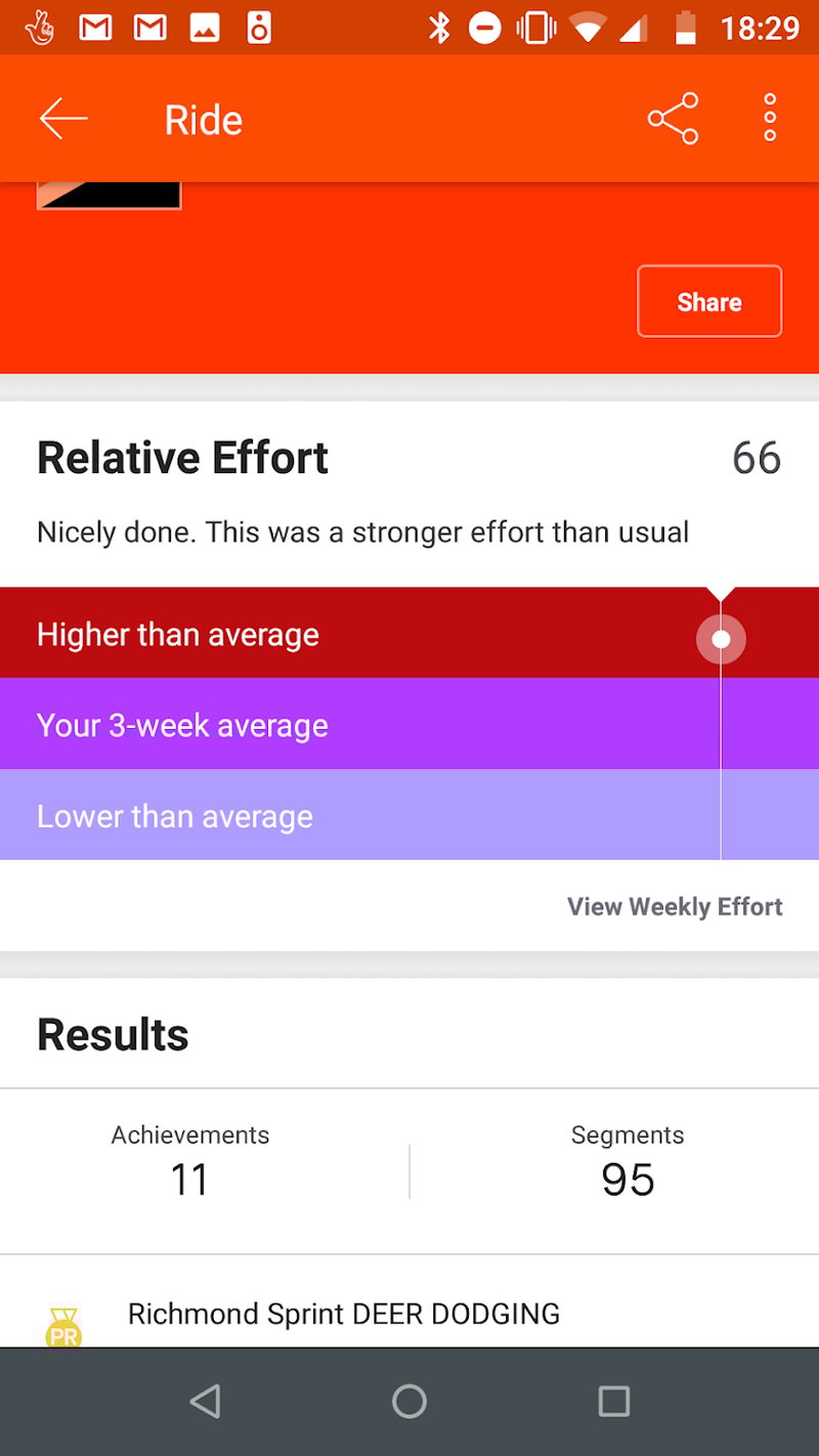 I don’t find the relative effort score matches my bodies feedback. I can smash a weight training session for an hour to the point my muscles are completely dead and the score is low 20-30ish.