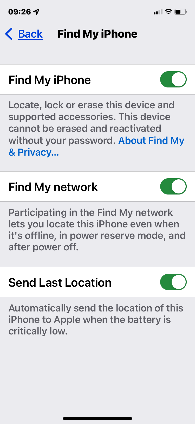 Here’s a screenshot of my settings on iOS15. On iOS14 or iPhone 10 (and earlier models), you should see different text underneath the phrase Find My network and the find when off feature won’t work for you.