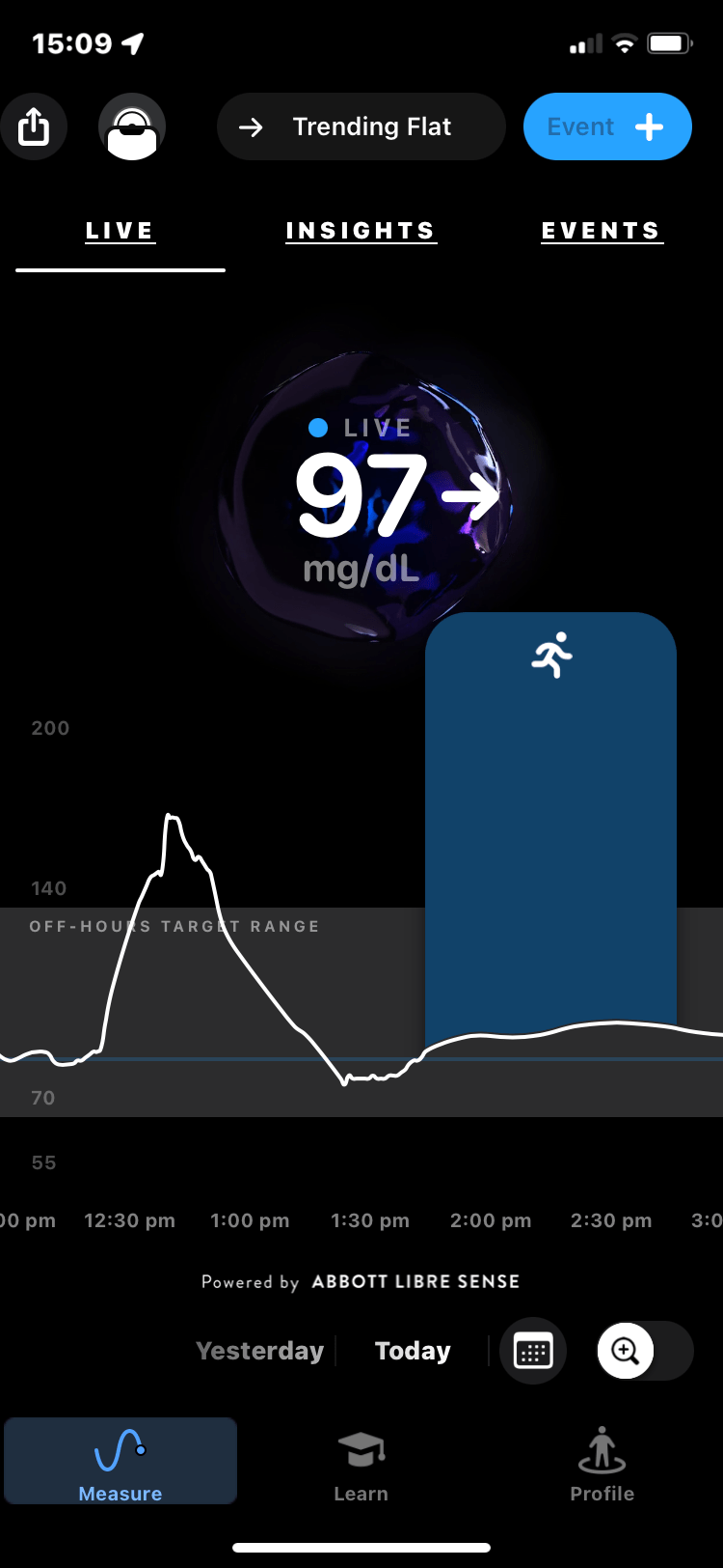 The Supersapiens app looks good and has live data, charts and all sorts of goodness that, no doubt, I will delve into over the next few weeks. You can tag the continuous chart of glucose with events like EATING or RUNNING and it is possible to automatically import workouts from Apple Health but NOT from other sports data platforms like Strava, Garmin Connect or Wahoo Fitness.