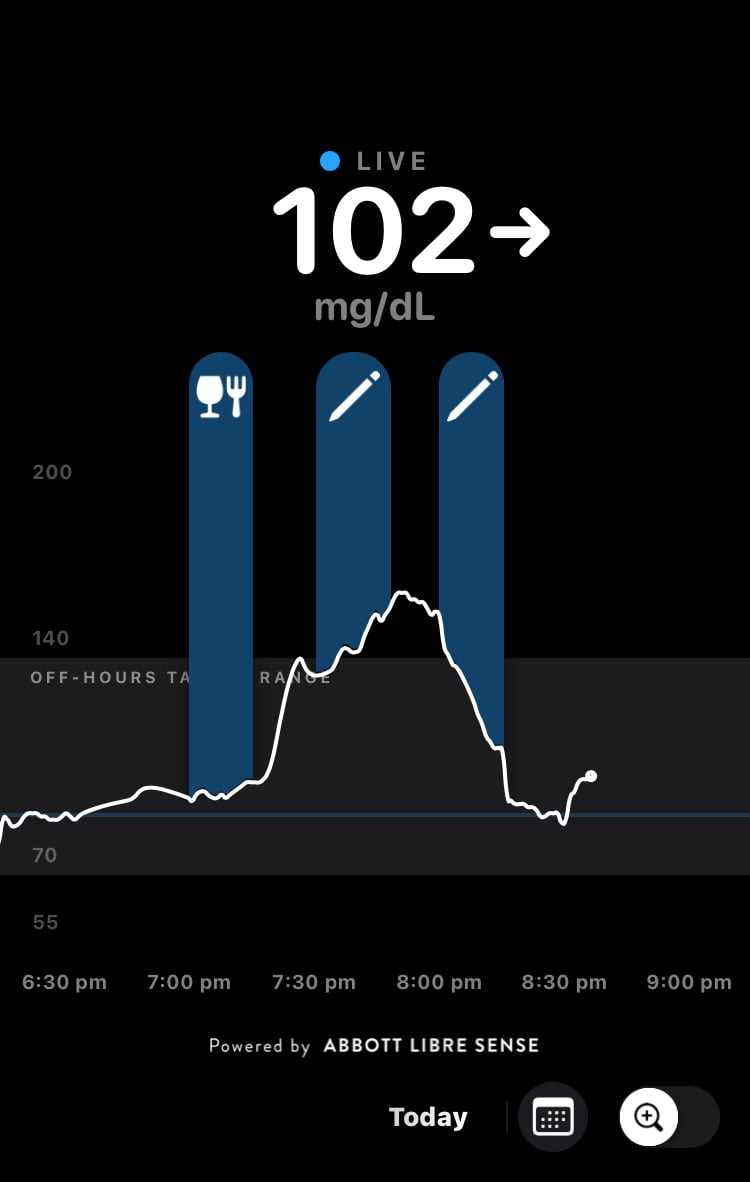 Obviously, if I was doing anything other than sitting down or had a full stomach, the energy-usage impact on the glucose curve would be very different.
