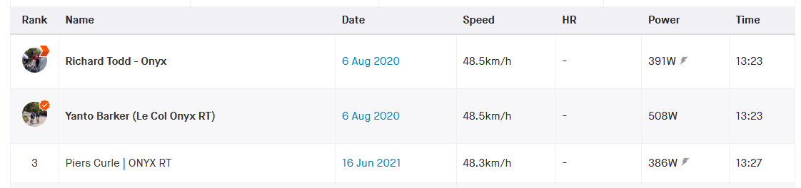 However, now the original story has resurfaced on the BBC website. It’s not as impressive as I’d hoped and involves Graham Bell (GBR Olympic Presenter and skier) completing a lap in a respectable 19 minutes on a road bike interspersed with an interview with David. There are some shots of Mr Millar on his Cervelo P4 and full race gear which was probably cutting edge when filmed in 2011. He doesn’t seem to be going that fast in the video but his lap time came out as 13:35 which compares very favourably with the many hundreds of thousands of laps (millions?) completed since then. Indeed 13:35 (29.6mph/47.6kmh) would still rank as a top 20 effort over this segment (link: strava.com), although it must be said that this segment is not quite a complete lap so if he really did a complete lap to the Car Park where the video is filmed then it’s probably a Top 10 effort. Add to that was the fact that he did it solo and it’s more impressive; you can see from the leaderboard, below, that the Top 2 times are probably two Team Onyx members working together (apologies if not).