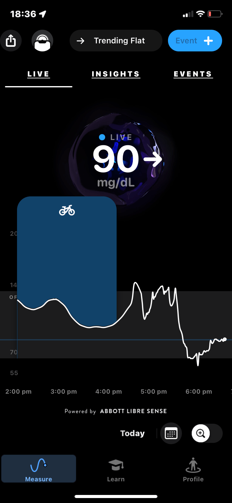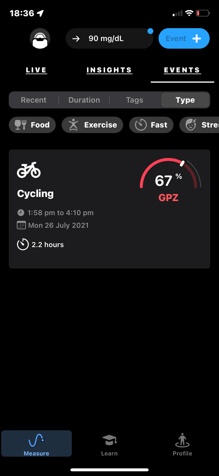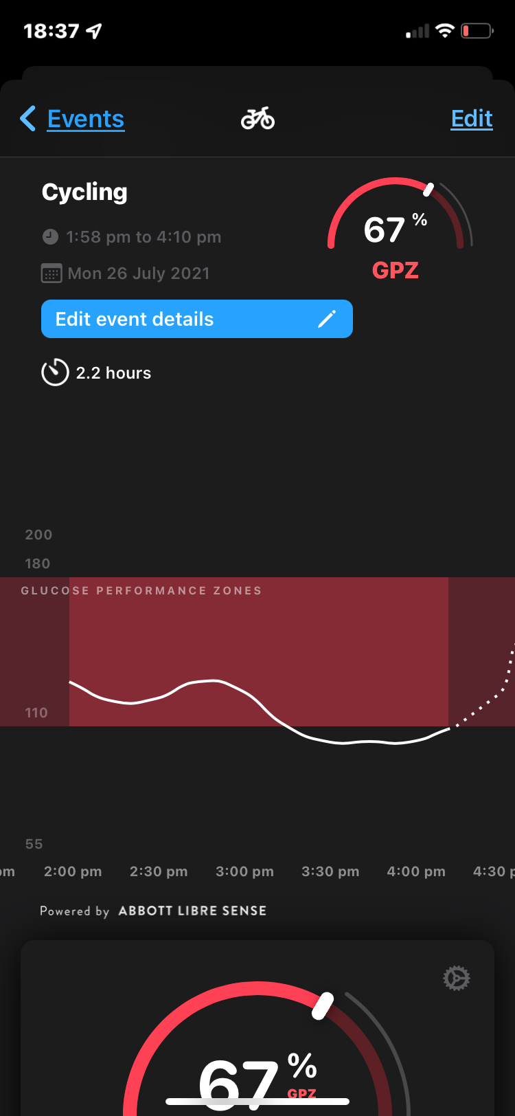 From a lifestyle point of view, that information is important for an athlete too who simply wants to better understand and regulate aspects of their body. For this purpose, Supersapiens has an Off-Hours range and the highs and lows of this typical range are continuously shown on the app. Relatively obvious things happen like your reading going above the upper limit of 30-minutes, or so, after having a piece of cake. I was expecting less obvious things to be shown as well, For example, I’d assumed that my late afternoon nap would be explained by low blood sugar levels but instead, the reality seems to be that I’m just getting older!