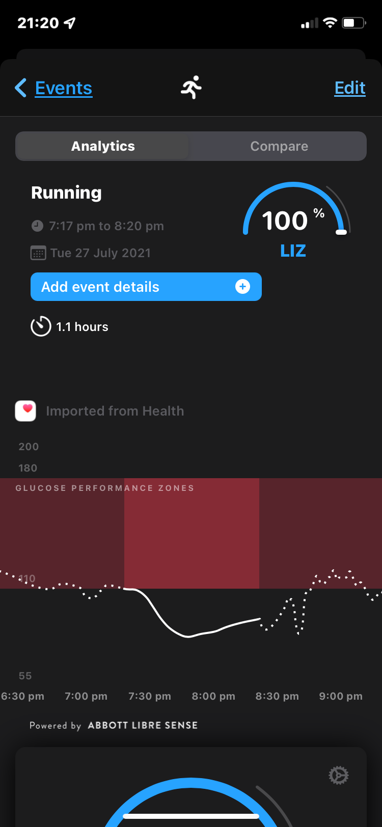 In this case, Supersapiens automatically uploaded my run from the Apple Watch 6 and then performed its Glucose analysis over the duration of the workout.
