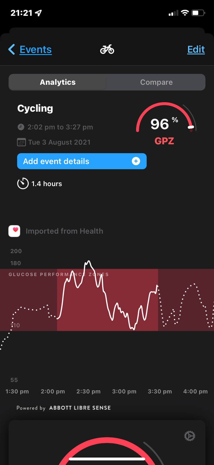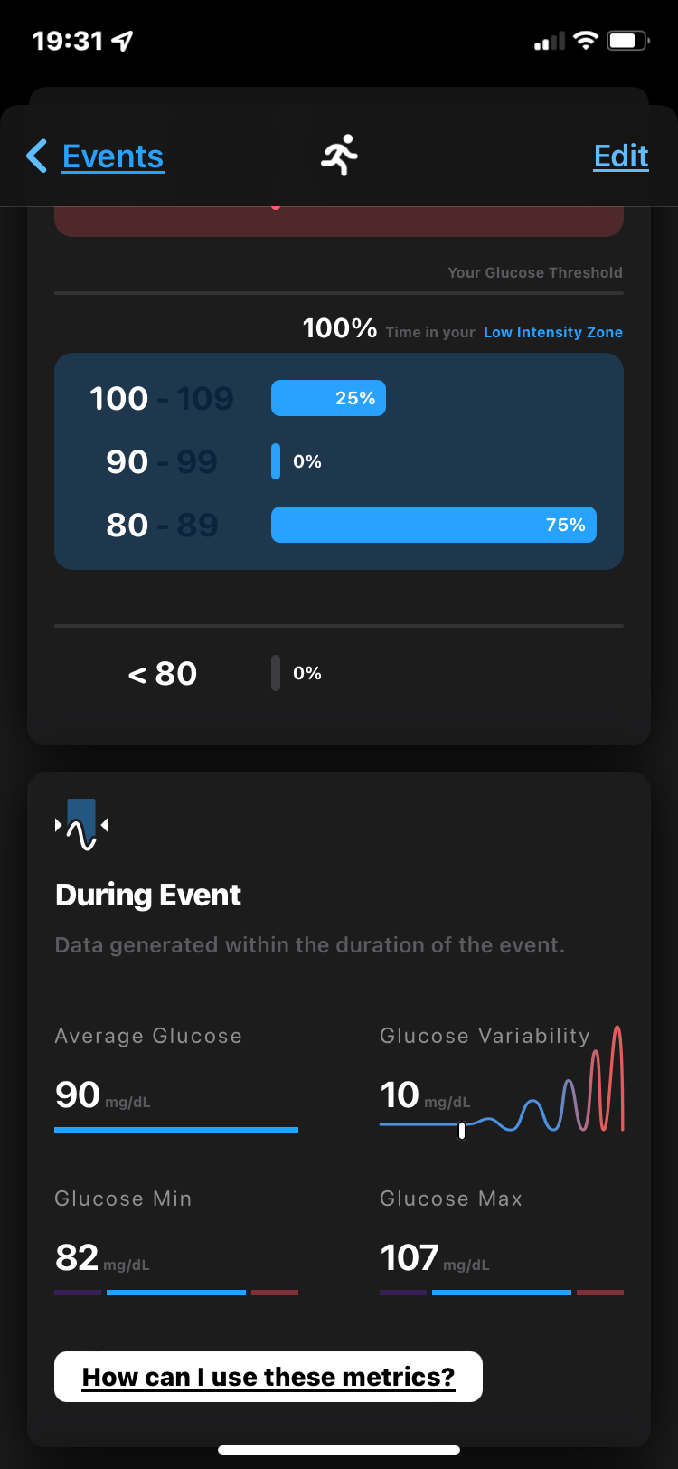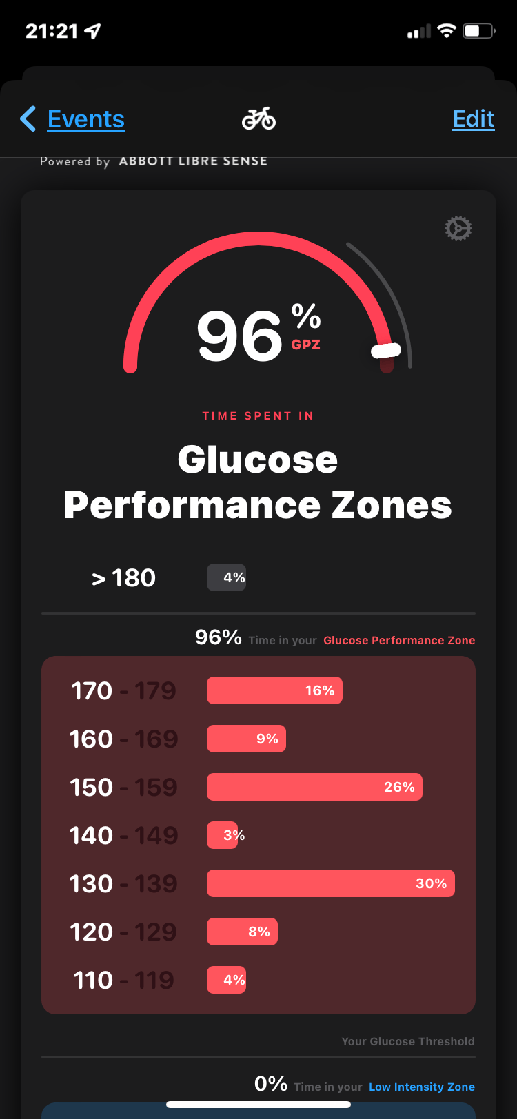 The third and fourth images show my glucose levels in the workout as sub-zones and also in the context of average and of pre-event levels.