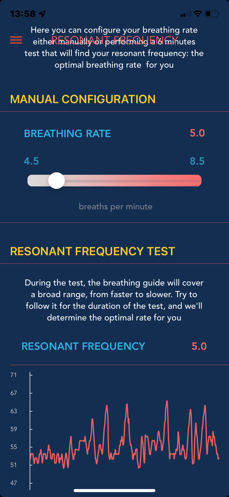 The resonant frequency test is a guided breathing session that guides you through variable breathing rates whilst simultaneously measuring your HRV. In my case, my resonant frequency was 5 or 5.5 breaths/minute and 6 is more normal.