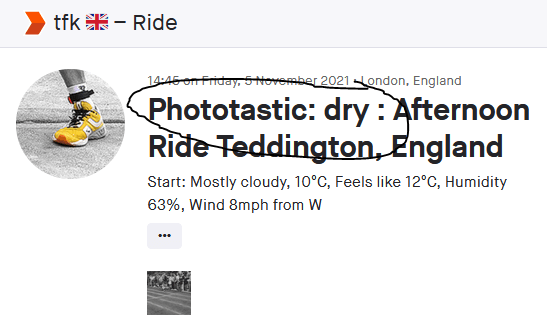 I added a photo to today’s ride and here you can see the before and after effects where Strautomater added the word PHOTOTASTIC to the description as well as prepending the weather conditions as DRY. Then you can see how the changed activity title appears in MY ACTIVITY.