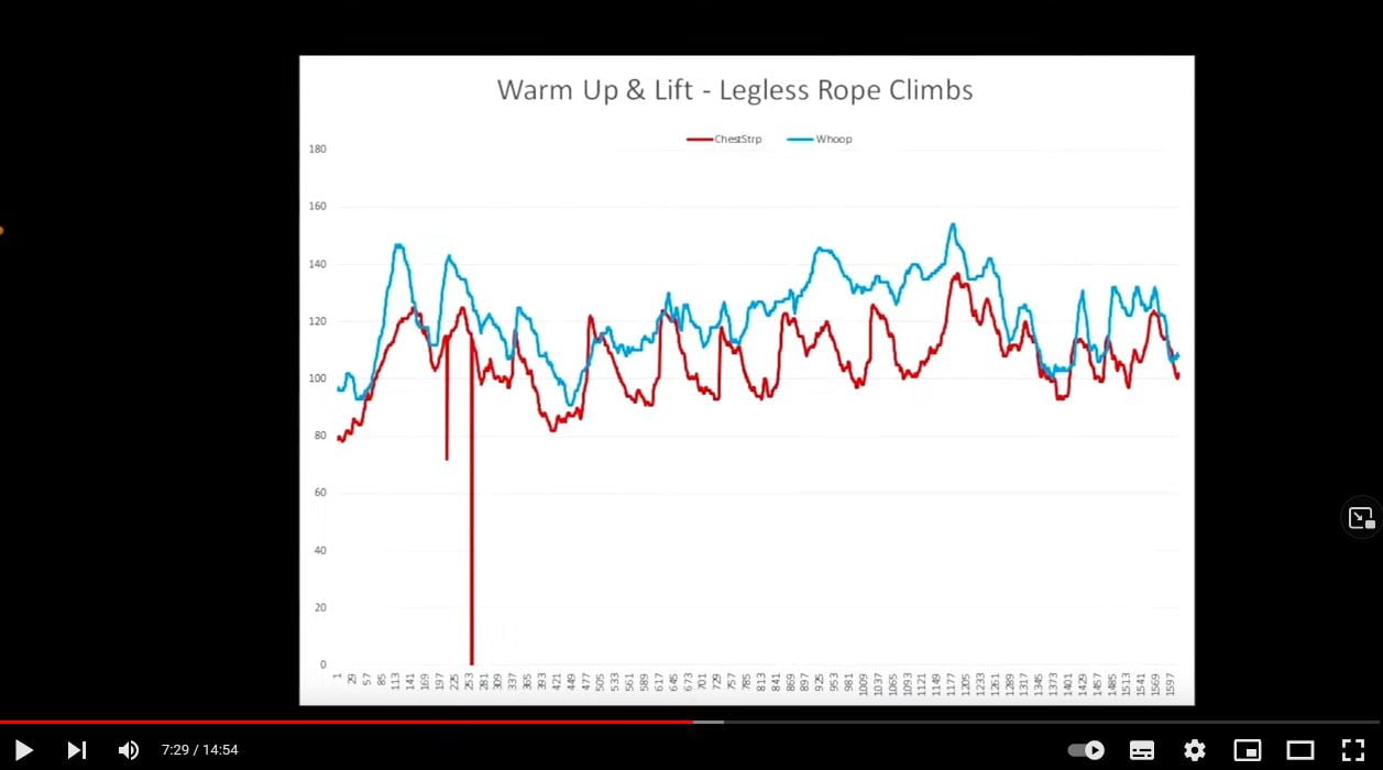 These first tests from Hunter are all with WHOOP worn on the wrist, which is typically a common, but bad, place for optical HR devices and even worse when lifting and twisting in the gym. His subsequent tests will use the upper forearm and bicep, the latter should hopefully produce good to excellent results (edit: that seems to be the case). For some of my tests, I’ll probably also wear WHOOP on the underside of my wrist as I seem to get better results there, although my aim for my own stats will be to always wear it with a WHOOP arm sleeve during exercise.