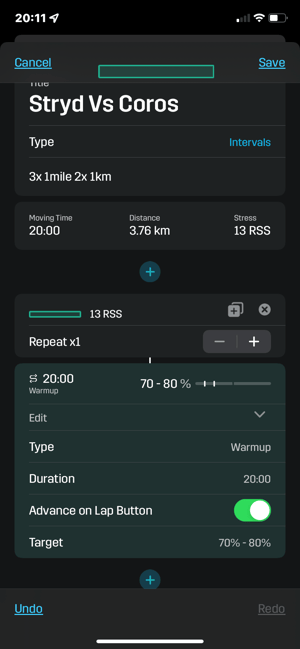 - For the warmup, I had to set a duration longer than I expect to use. That’s OK as I can use LAP to end the step and progress to the workout proper.