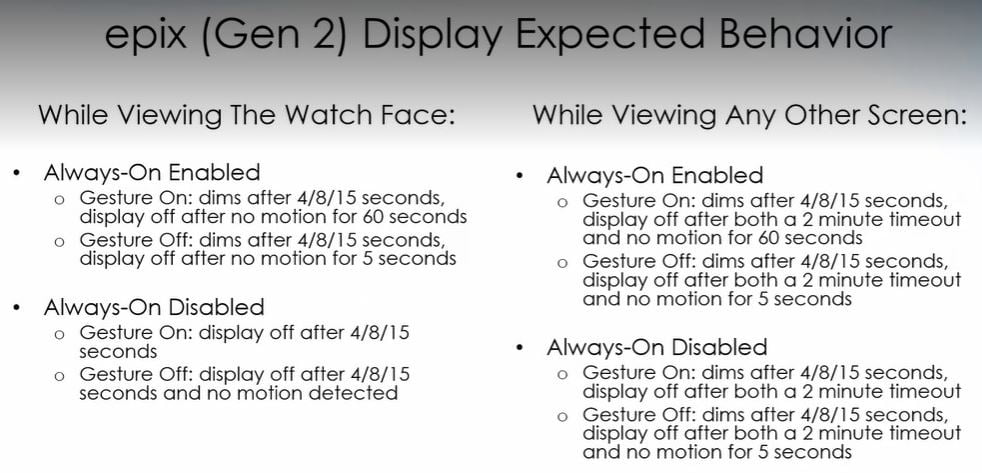 The following chart from Garmin summarises Epix’s screen behaviour in a somewhat complicated way. The screen’s overall brightness is dimmed when not in use and turned off when REALLY not in use. Because Garmin has achieved some great battery lives here; they do NOT have to make some of the occasionally silly compromises that Apple/Samsung have to.