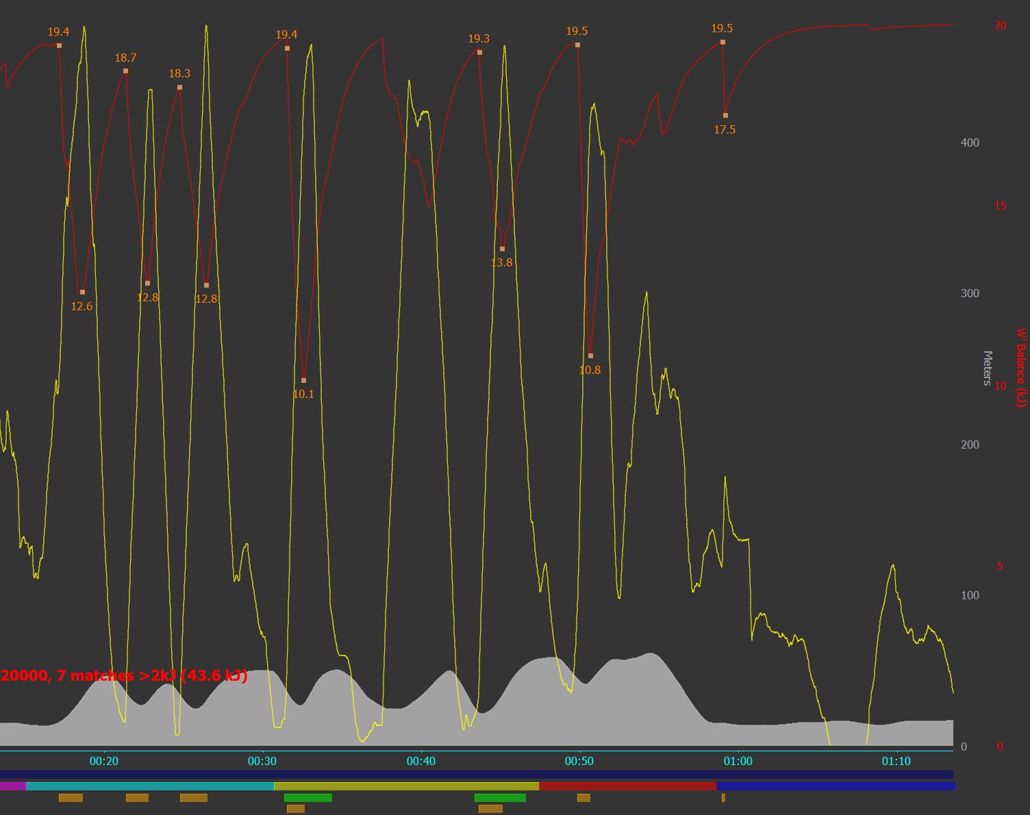 I think it’s starting to make sense now. It reminds me of W’ Bal, which I use as a power-based metric in Golden Cheetah and which represents my remaining anaerobic energy levels. It’s the red line in the following chart from a ride where I was doing some ‘quite hard’ road bike hill reps. These were all anaerobic reps and you can see that I quickly ate into my anaerobic reserves which are subsequently replenished back up close to the red 20Kj level as I cruise down the next hill for the next rep.