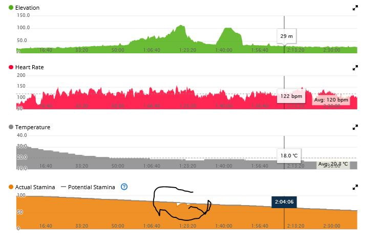 If you look again at how close the yellow line recovers to the Potential Stamina line it’s pretty similar to what I showed further above on the Golden Cheetah chart where the red line doesn’t quite recover to 20Kj.