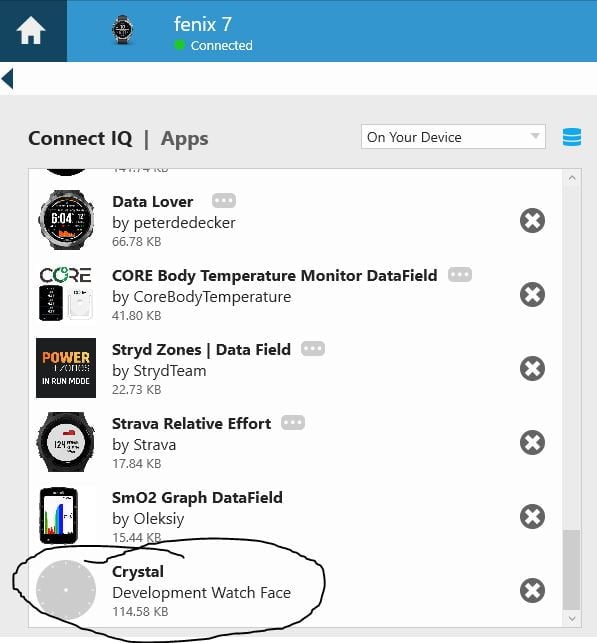 If you then check the installed apps on Garmin Express you might see that your favourite app/watch face/data field from your old watch is now listed as a ‘Development’ version. In this example, the Crystal watch face isn’t available on the F7 but I copied it across from the F6Pro and it seems to work fine.