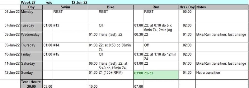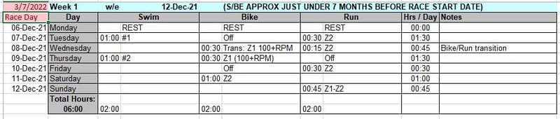 So if you were following a Fink plan for IM Bolton this year, then your training at week 1 and at week 27 would look something like the two weeks in these images, yet your weekly progression adds no more than 30 minutes each time and it might take you until week 12 or week 20 to really start to feel tired.