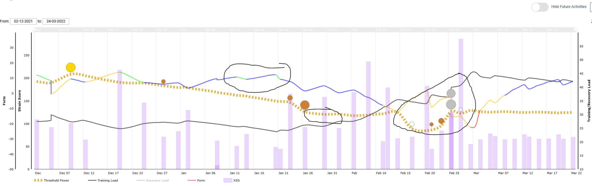- Finally, there are the multi-coloured circles which represent breakthroughs at various performance levels. So there could be an FTP-like breakthrough or an endurance breakthrough and Xert even highlights near misses when you oh so nearly made a breakthrough,