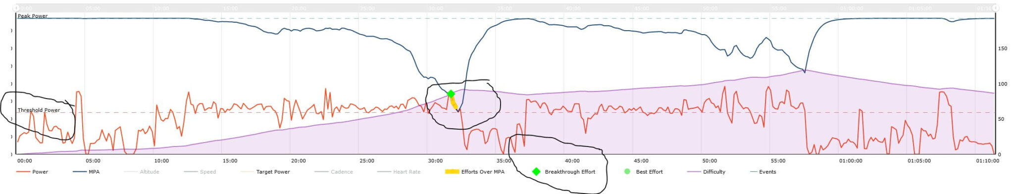 The purple line represents the increasing difficulty and the red line is the power. At the point of the green triangle, I have achieved a breakthrough which is kinda like a power-duration PB but adjusted for fatigue.