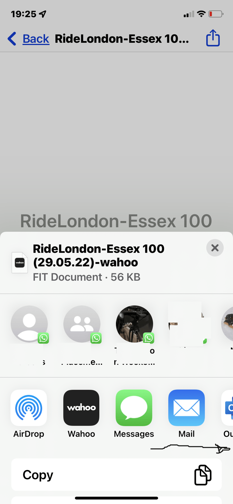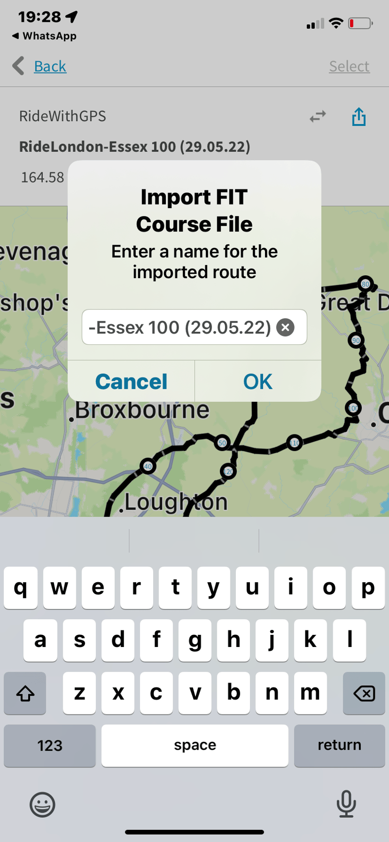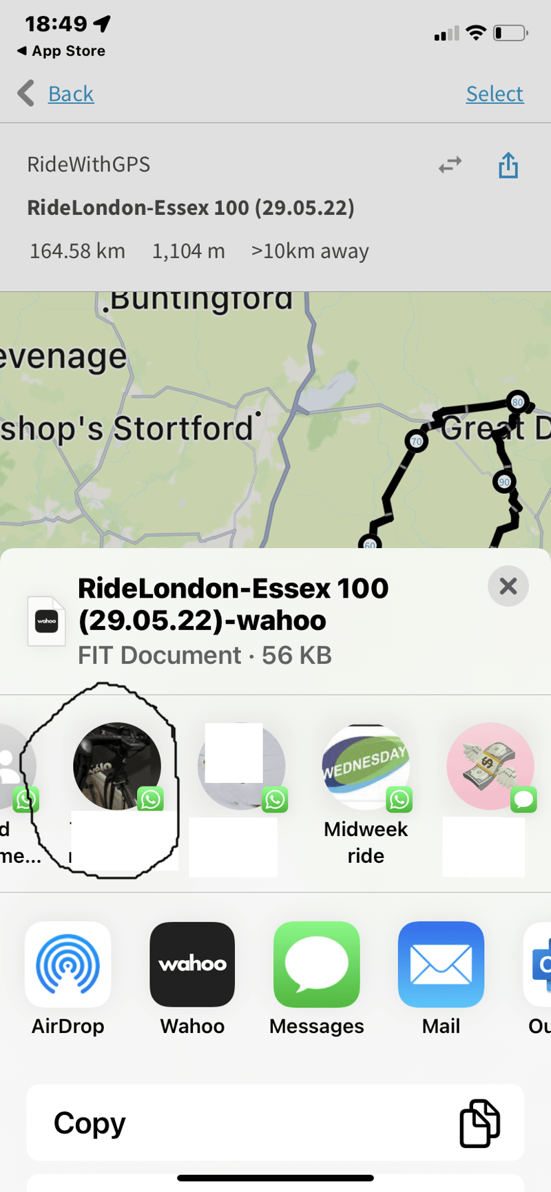 If you update your ELEMNT app you should now be able to send an existing route to lots of other people via various apps and methods. Here is the screenflow from my Wahoo Bolt 2 where I find this year’s new Ride London Route, already synced from RwGPS. Next, I push it to the WhatsApp group we have just for those of us going on the Ride London. You can send it to other places too of course…AirDrop could be an interesting option if you all have iPhones present at the start of a ride.